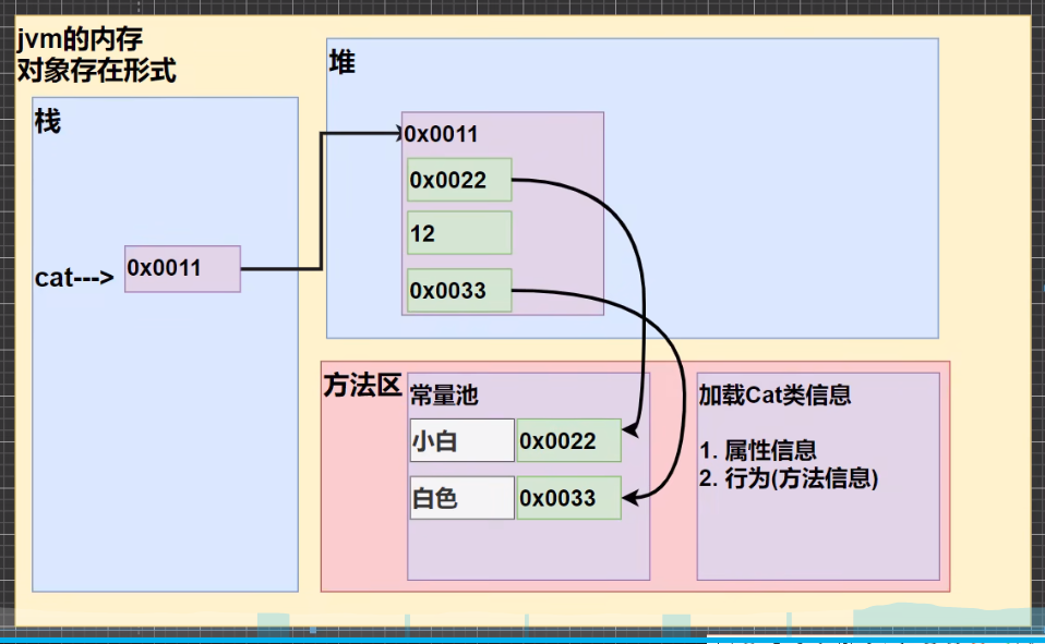 当Cat类被new时,同时会在方法区对类的信息进行一个加载,加载内容是==属性信息==和==方法==。