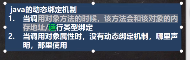 同时满足:**==编译类型看左边,运行类型看右边==**(可以调用父类所有成员(看权限),不能调用子类特有成员,因为调用是由编译类型决定的,调用方法时,先从子类开始找,如果有则运行子类的方法,特别是有方法重写的时候)